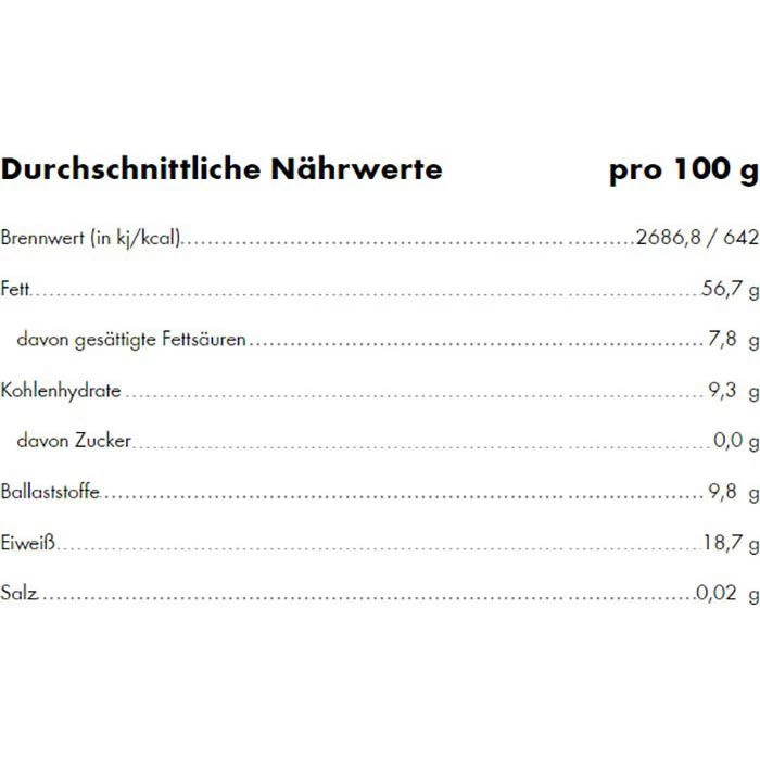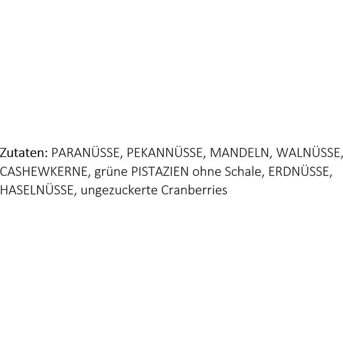 Zutaten: PARANÜSSE, PEKANNÜSSE, MANDELN, WALNÜSSE, CASHEWKERNE, grüne PISTAZIEN ohne Schale, ERDNÜSSE, HASELNÜSSE, ungezuckerte Cranberries