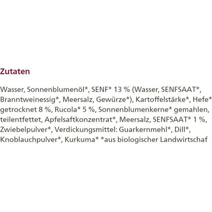 Zutaten: Wasser, Sonnenblumenöl*, SENF* 13% (Wasser, SENFSAAT*, Branntweinessig*, Meersalz, Gewürze*), Kartoffelstärke*, Hefe* getrocknet 8%, Rucola* 5%, Sonnenblumenkerne* gemahlen, teilentfettet, Apfelsaftkonzentrat*, Meersalz, SENFSAAT* 1%, Zwiebelpulver*, Verdickungsmittel: Guarkernmehl*, Dill*, Knoblauchpulver*, Kurkuma*