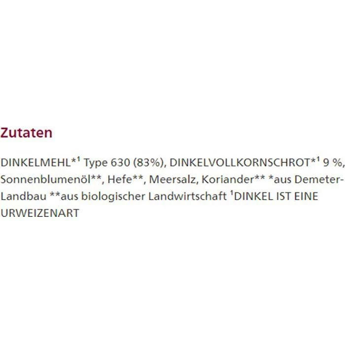 Zutaten: DINKELMEHL*¹ Type 630 (83%), DINKELVOLLKORNSCHROT* 9%, Sonnenblumenöl**, Hefe**, Meersalz, Koriander**