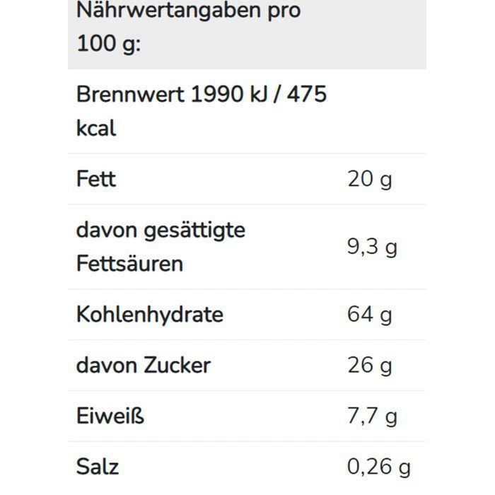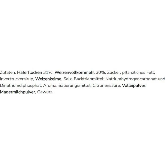 HAFERFLOCKEN 31%, WEIZENVOLLKORNMEHL 30%, Zucker, pflanzliches Fett, Invertzuckersirup, WEIZENKEIME, Salz, Backtriebmittel: Natriumcarbonate, Diphosphate, Aroma, Säuerungsmittel: Citronensäure, HÜHNERVOLLEIPULVER, MAGERMILCHPULVER, Gewürz