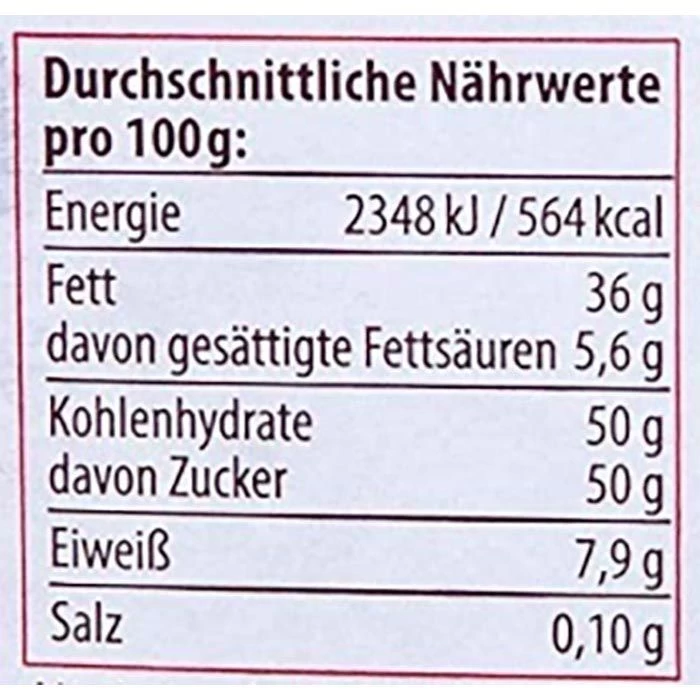 Zutaten: Zucker, 36% HASELNÜSSE, pflanzliches Öl (Sonnenblume), pflanzliches Fett (Sal), fettarmes Kakaopulver, MAGERMILCHPULVER, Emulgatoren: Lecithin und Salz