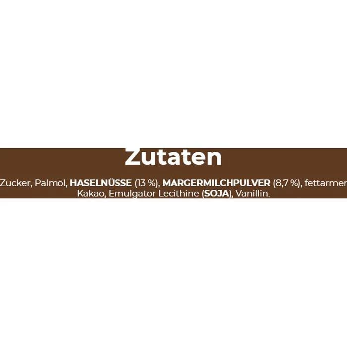 Zutaten: Zucker, Palmöl, HASELNÜSSE (13%), MAGERMILCHPULVER (8,7%), fettarmer Kakao, Emulgator Lecithine (SOJA), Vanillin