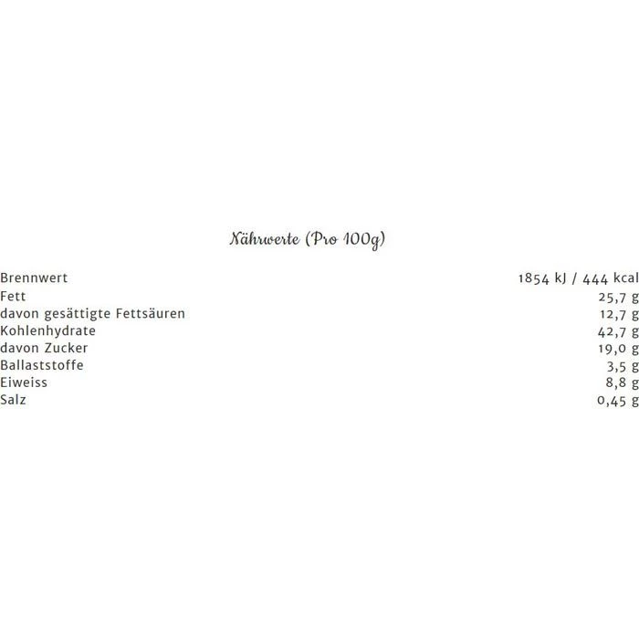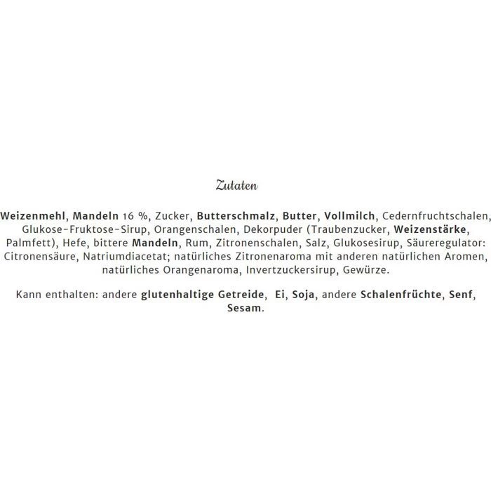 Zutaten: WEIZENMEHL, MANDELN 16%, Zucker, BUTTERSCHMALZ, BUTTER, VOLLMILCH, Cedernfruchtschalen, Glukose-Fruktose-Sirup, Orangenschalen, Dekorpuder (Traubenzucker, WEIZENSTÄRKE, Palmfett), Hefe, bittere MANDELN, Rum, Zitronenschalen, Salz, Glukosesirup, Säureregulator: Citronensäure, Natriumdiacetat; natürliche Aromen, Invertzuckersirup, Gewürze