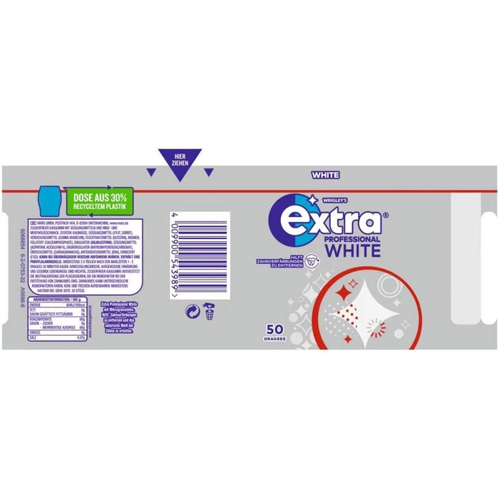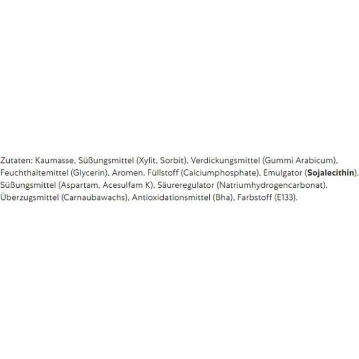Kaumasse, Süßungsmittel Xylit, Sorbit; Verdickungsmittel Gummi Arabicum, Feuchthaltemittel Glycerin, Aromen, Füllstoff Calciumphosphate, Emulgator SOJALECITHIN, Süßungsmittel Aspartam, Acesulfam K; Säureregulator Natriumhydrogencarbonat, Überzugsmittel Carnaubawachs, Antioxidationsmittel Bha, Farbstoff E133