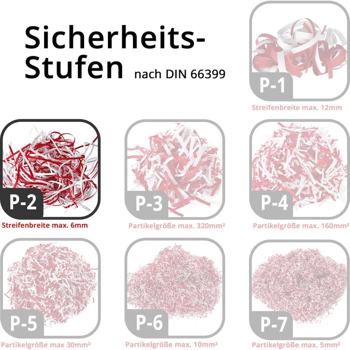 Sicherheitsstufe DIN 66399: P-2, O-1, T-2 (siehe PDF Datenblatt)