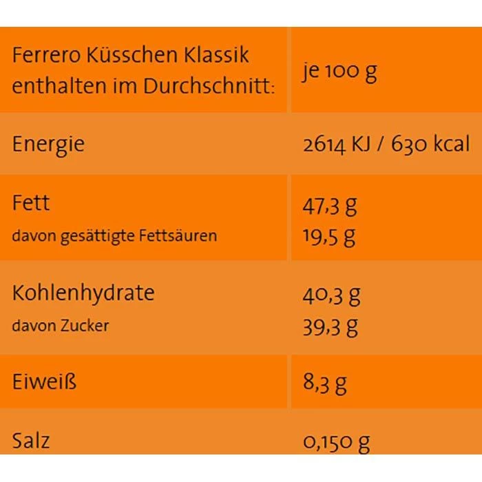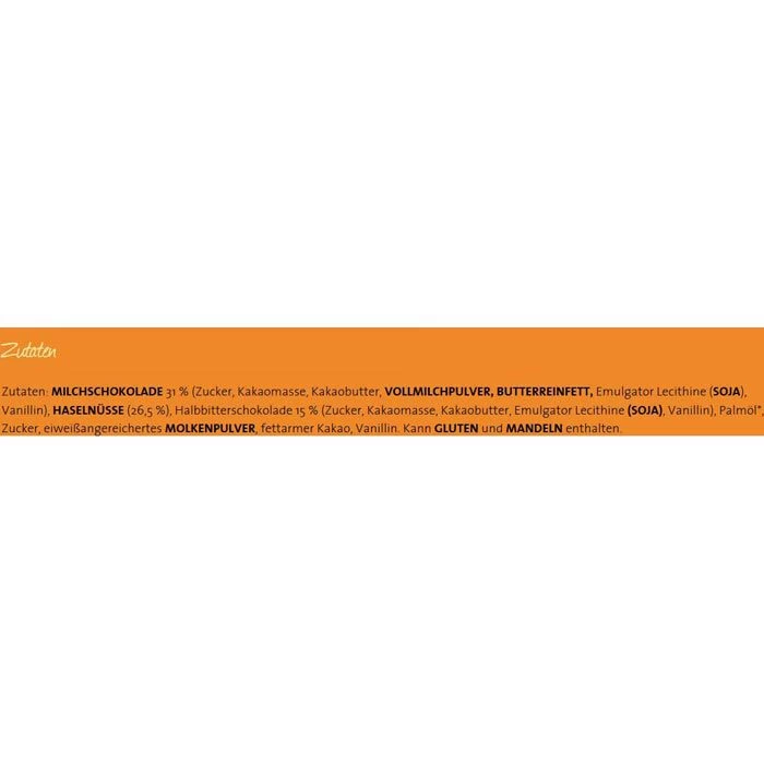 Zutaten: MILCHSCHOKOLADE 31% (Zucker, Kakaomasse, Kakaobutter, VOLLMILCHPULVER, BUTTERREINFETT, Emulgator Lecithine (SOJA), Vanillin), HASELNÜSSE (26,5%), Halbbitterschokolade 15% (Zucker, Kakaomasse, Kakaobutter, Emulgator Lecithine (SOJA), Vanillin), Palmöl, Zucker, eiweißangereichertes MOLKENPULVER, fettarmer Kakao, Vanillin