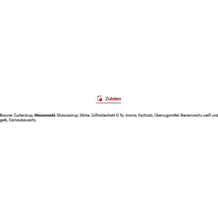 Zutaten: Brauner Zuckersirup; WEIZENMEHL; Glukosesirup; Stärke; Süßholzextrakt (3%); Aroma; Kochsalz; Überzugsmittel: Bienenwachs weiß und gelb, Carnaubawachs