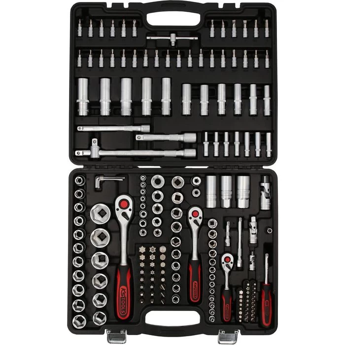 sonstiges: Steckschlüssel-Satz 1/2 Zoll + 3/8 Zoll + 1/4 Zoll, Chrom-Vanadium-Stahl, matt satiniert verchromt, klemmgesicherte Werkzeuge im stabilen Kunststoffkoffer