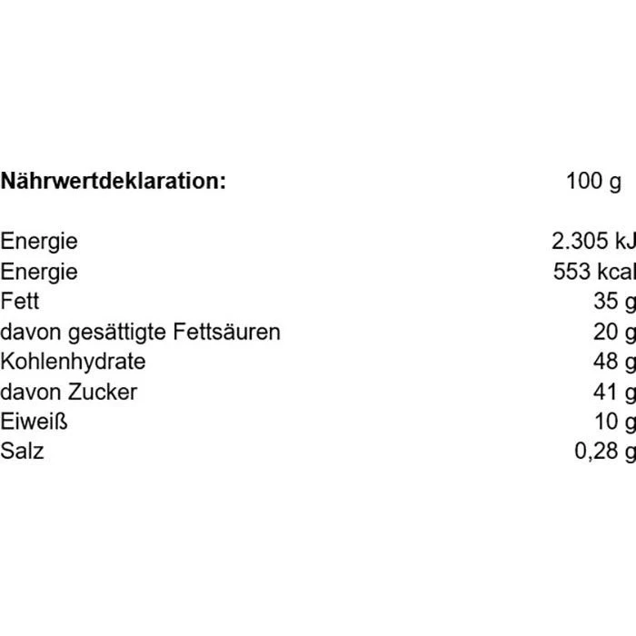 Zutaten: MILCHSCHOKOLADE 39% (Zucker, Kakaomasse, Kakaobutter, VOLLMILCHSCHOKOLADE, MAGERMILCHPULVER, Emulgator SOJELECITHINE), HASELNÜSSE 27% in der Creme, Zucker, Kokosöl, SÜSSMOLKENPULVER (MILCH), WEIZENMEHL, MAGERMILCHPULVER, GERSTENMALZEXTRAKT, SAHNEPULVER (MILCH), magerer Kakao, Emulgator Sojalecithine, Backtriebmittel (Natriumhydrogencarbonat, Dinatriumdiphosphat), Salz, SOJAMEHL, Bourbon Vanilleschoten, Gewürze