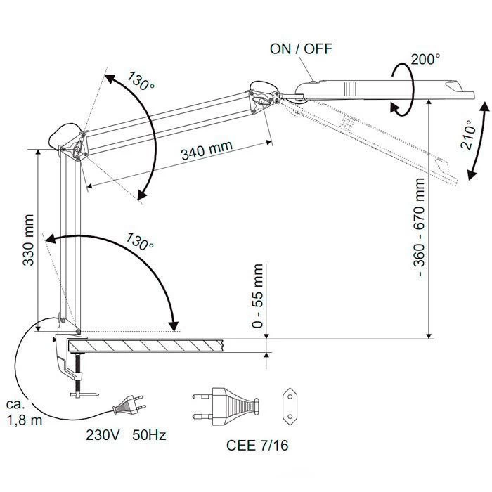 sonstiges: mit Gelenkarm und drehbarem Leuchtenkopf, Schalter am Leuchtenkopf, stabiler Standfuß mit Beschwerungseinlagen