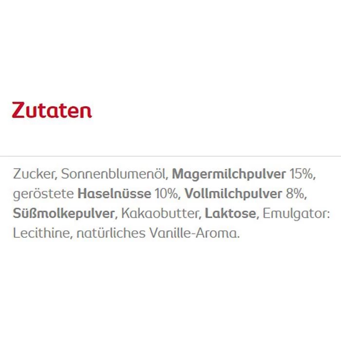 Zutaten: Zucker, Sonnenblumenöl, MAGERMILCHPULVER 15%, geröstete HASELNÜSSE 10%, VOLLMILCHPULVER 8%, SÜSSMOLKENPULVER, Kakaobutter, LAKTOSE, Emulgator: Lecithine, natürliches Vanille-Aroma.
