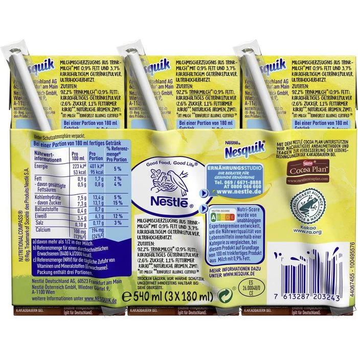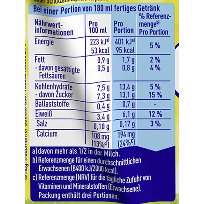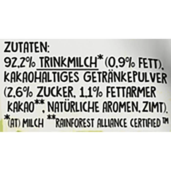 Zutaten: 92,2% TRINKMILCH (0,9% Fett), kakaohaltiges Getränkepulver (2,6% Zucker, 1,1% fettarmer Kakao**, natürliche Aromen, Zimt). **Rainforest Alliance Certified(TM)