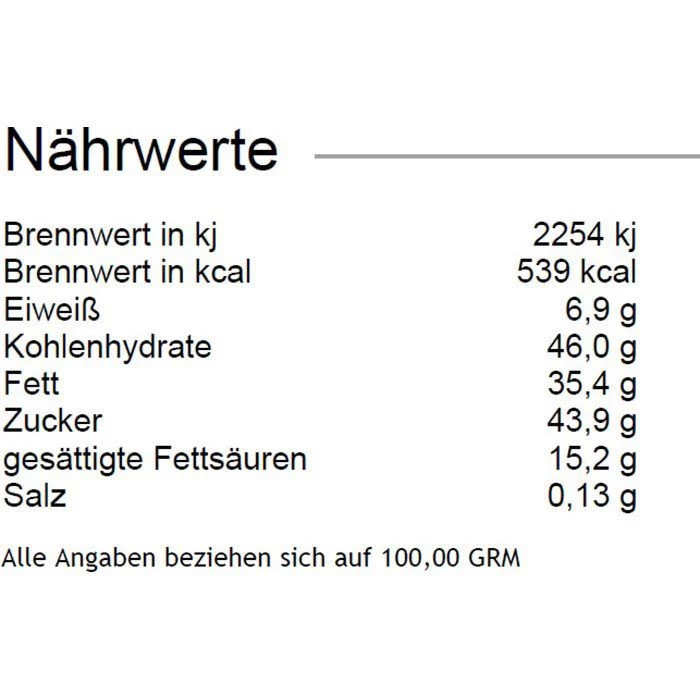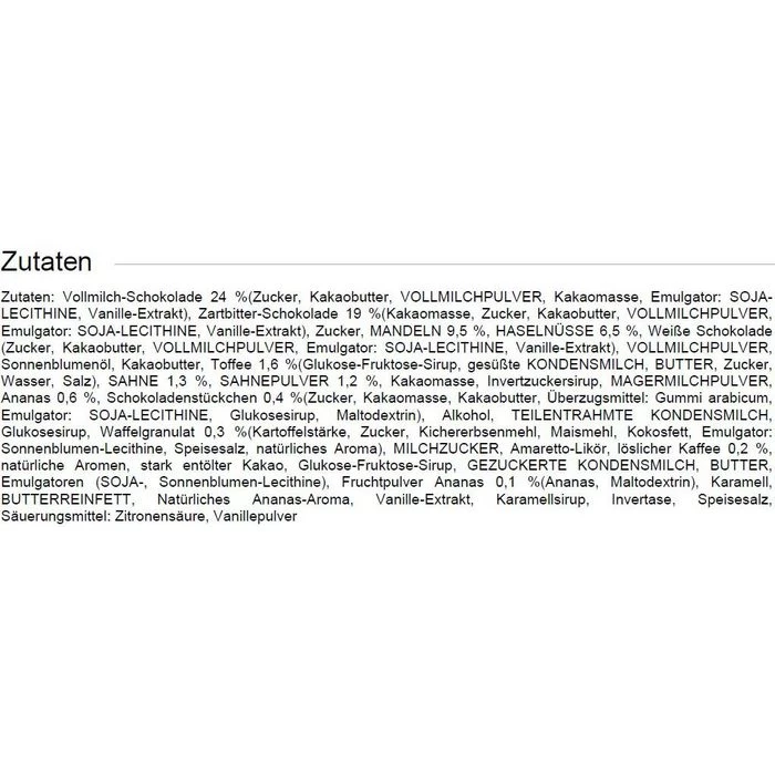 Zutaten: Vollmilch-Schokolade 24% (Zucker, Kakaobutter, VOLLMILCHPULVER, Kakaomasse, Emulgator: SOJALECITHINE, Vanille-Extrakt), Zartbitter-Schokolade 19% (Kakaomasse, Zucker, Kakaobutter, VOLLMILCHPULVER, Emulgator: SOJA-LECITHINE, Vanille-Extrakt), Zucker, MANDELN 9,5%, HASELNÜSSE 6,5%, Weiße Schokolade (Zucker, Kakaobutter, VOLLMILCHPULVER, Emulgator: SOJA-LECITHINE, Vanille-Extrakt), VOLLMILCHPULVER, Sonnenblumenöl, Kakaobutter, Toffee 1,6% (Glukose-Fruktose-Sirup, gesüßte KONDENSMILCH, BUTTER, Zucker, Wasser, Salz), SAHNE 1,3%, SAHNEPULVER 1,2%, Kakaomasse, Invertzuckersirup, MAGERMILCHPULVER, Ananas 0,6%, Schokoladenstückchen 0,4% (Zucker, Kakaomasse, Kakaobutter, Überzugsmittel: Gummi arabicum, Emulgator: SOJA-LECITHINE, Glukosesirup, Maltodextrin), Alkohol, TEILENTRAHMTE KONDENSMILCH, Glukosesirup, Waffelgranulat 0,3% (Kartoffelstärke, Zucker, Kichererbsenmehl, Maismehl, Kokosfett, Emulgator: Sonnenblumen-Lecithine, Speisesalz, natürliches Aroma), MILCHZUCKER, Amaretto-Likör, löslicher Kaffee 0,2%, natürliche Aromen, stark entölter Kakao, Glukose-Fruktose-Sirup, GEZUCKERTE KONDENSMILCH, BUTTER, Emulgatoren (SOJA-, Sonnenblumen-Lecithine), Fruchtpulver Ananas 0,1% (Ananas, Maltodextrin), Karamell, BUTTERREINFETT, Natürliches Ananas-Aroma, Vanille-Extrakt, Karamellsirup, Invertase, Speisesalz, Säuerungsmittel: Zitronensäure, Vanillepulver