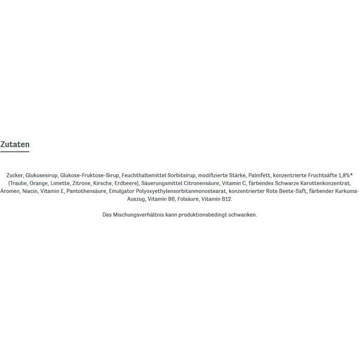 Zutaten: Zucker, Glukosesirup, Glukose-Fruktose-Sirup, Feuchthaltemittel Sorbitsirup, modifizierte Stärke, Palmfett, konzentrierte Fruchtsäfte 1,8%* (Traube, Orange, Limette, Zitrone, Kirsche, Erdbeere), Säuerungsmittel Citronensäure, Vitamin C, färbendes Schwarze Karottenkonzentrat, Aromen, Niacin, Vitamin E, Pantothensäure, Emulgator Polyoxyethylensorbitanmonostearat, konzentrierter Rote Beete-Saft, Vitamin B6, färbender Kurkuma-Auszug, Folsäure, Vitamin B12