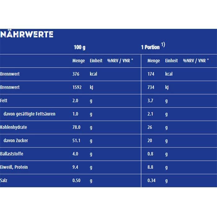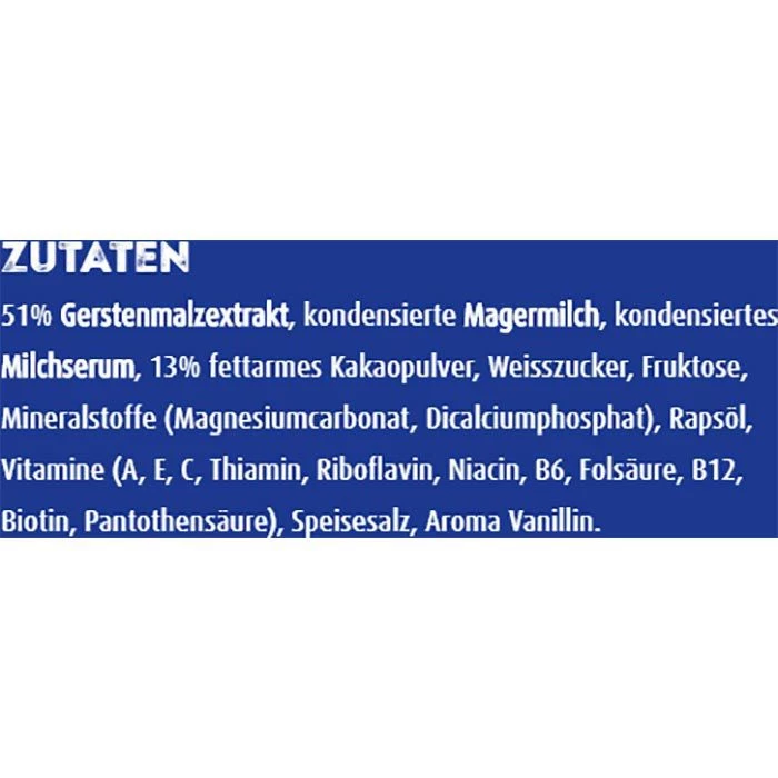 Zutaten: 51% GERSTENMALZEXTRAKT, kondensierte MAGERMILCH, kondensiertes MILCHSERUM, 13% fettarmes Kakaopulver, Weisszucker, Fruktose, Mineralstoffe (Magnesiumcarbonat, Dicalciumphosphat), Rapsöl, Vitamine (A, E, C, Thiamin, Riboflavin, Niacin, B6, Folsäure, B12, Biotin, Pantothensäure), Speisesalz, Aroma Vanillin.