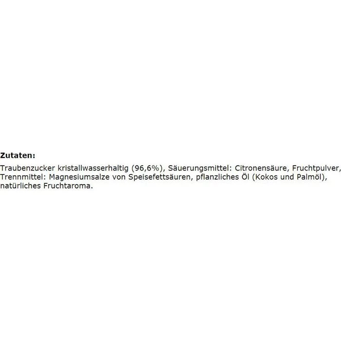 Traubenzucker kristallwasserhaltig (96,6%), Säuerungsmittel: Citronensäure, Fruchtpulver, Trennmittel: Magnesiumsalze von Speisefettsäuren, pflanzliches Öl (Kokos und Palmöl), natürliches Fruchtaroma