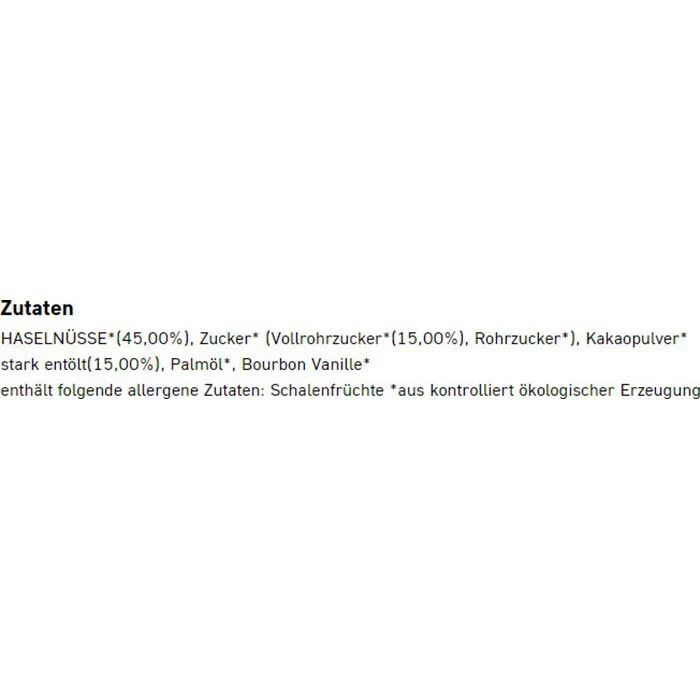 Zutaten: HASELNÜSSE (45%), Vollrohrzucker, Rohrzucker, Kakaopulver stark entölt (15%), Palmöl, Bourbon Vanille