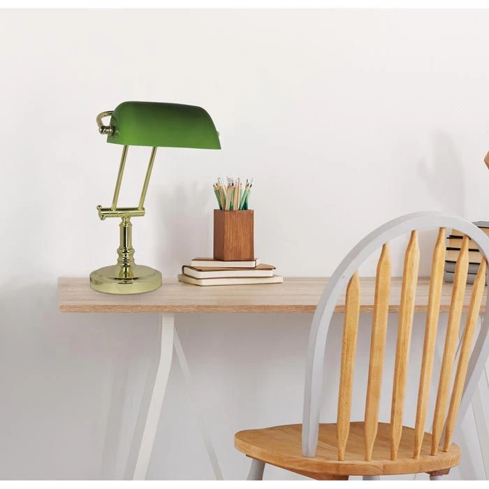sonstiges: Bankerlampe mit schwenkbarem Leuchtenkopf aus Glas und vermessingtem Lampenkörper, mit Gelenkarm