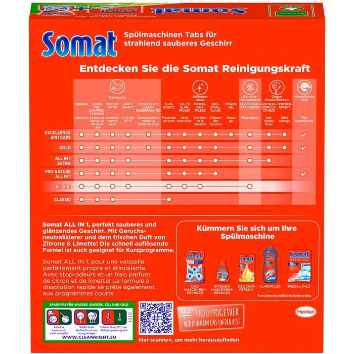 Funktionen: Reiniger, Klarspüler, Salzfunktion, Langzeit-Glasschutz, Spülkraftverstärker, Niedrigtemperatur-Aktivator, Geruchsneutralisierer