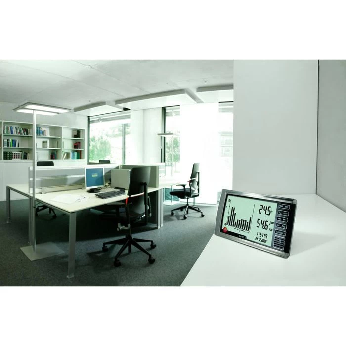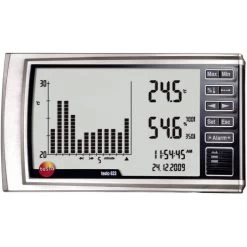 sonstiges: mit optischer Alarmfunktion für Unter- oder Überschreitung, Speicherung und Anzeige der Max.- und Min.-Werte, Histogramm-Anzeige mit einstellbarem Zeitintervall, Anzeige in C / °F , integrierte Stell- und Hängevorrichtung, Batteriewechselanzeige
