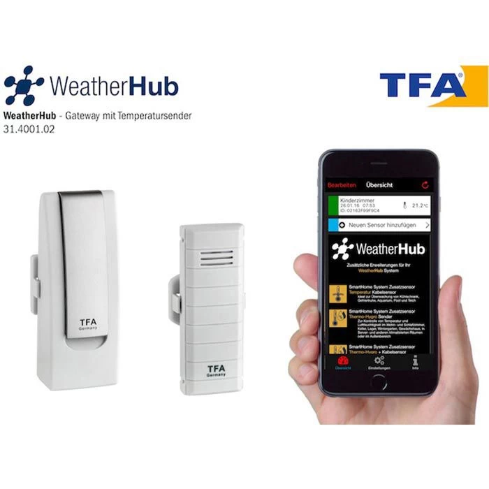 Das Gateway stellt die Verbindung zwischen den TFA-WeatherHub Geräten und dem WeatherHub Server dar. Somit lassen sich die Daten einfach via Browser oder App ablesen. Die Weatherhub Oberserver Plattform ist kostenfrei und vollständig browserbasiert. Datenexportmöglichkeiten als CSV oder PDF.