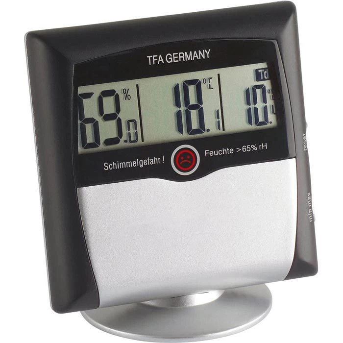 sonstiges: Alarmfunktion bei Schimmelgefahr, Speicherung und Anzeige der Max.- und Min.-Werte, zum Aufstellen mit beiliegendem Ständer oder Wandmontage geeignet, Anzeige in Celsius oder Fahrenheit umschaltbar