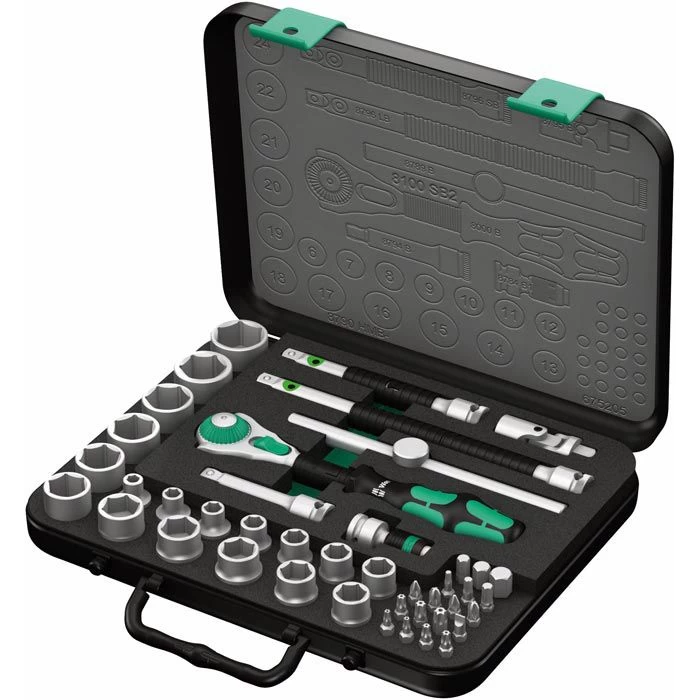 sonstiges: mit Werkzeugfinder Take it easy, sprich Farbkennzeichnung nach Größen, stabiler Metallkoffer mit zweifarbiger Schaumstoffeinlage, Knarrenkopf ist frei schwenkbar und kann durch Schiebeschalter in jeder Fixierungsposition verriegelt werden, über Rändelrad in jeder Position für Rechts-/Linksgang umschaltbar, 5 Knarrentypen in einer Knarre